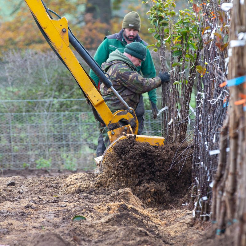 Grown in the field as a 2 year tree followed by a final year as container grown. This growing cycle involves 4 – 6 pruning operations to develop short spur bearing branches from 0.4m upwards, with a dominant central leader.