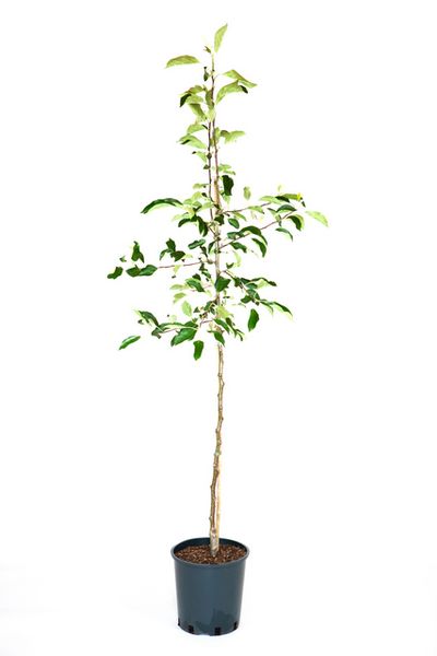 Ideal for patio tubs and smaller spaces as it produces a true mini tree. Height is no more than 2 metres with little support required. Heavy cropping fruit trees may need a permanent stake. Fruiting begins in the first year. Very little pruning needed.