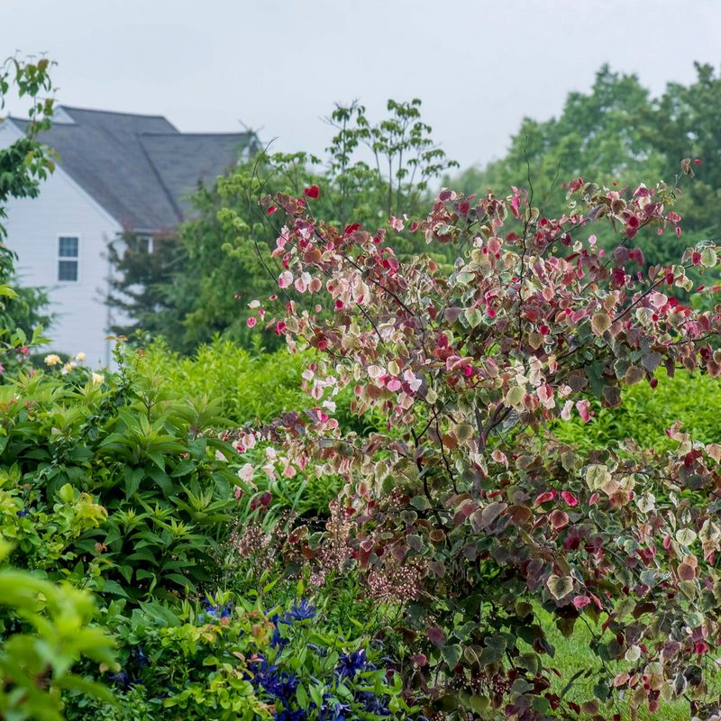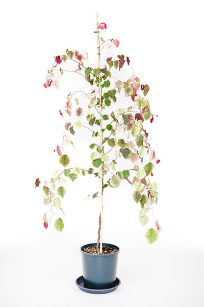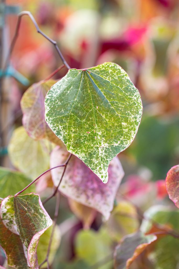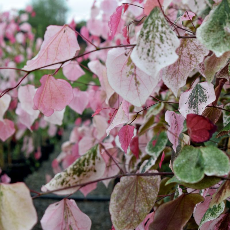 Rosy purple flowers in early spring, followed by heart-shaped pink, red and white leaves. Umbrella like habit. Read more