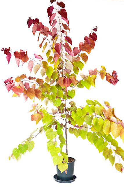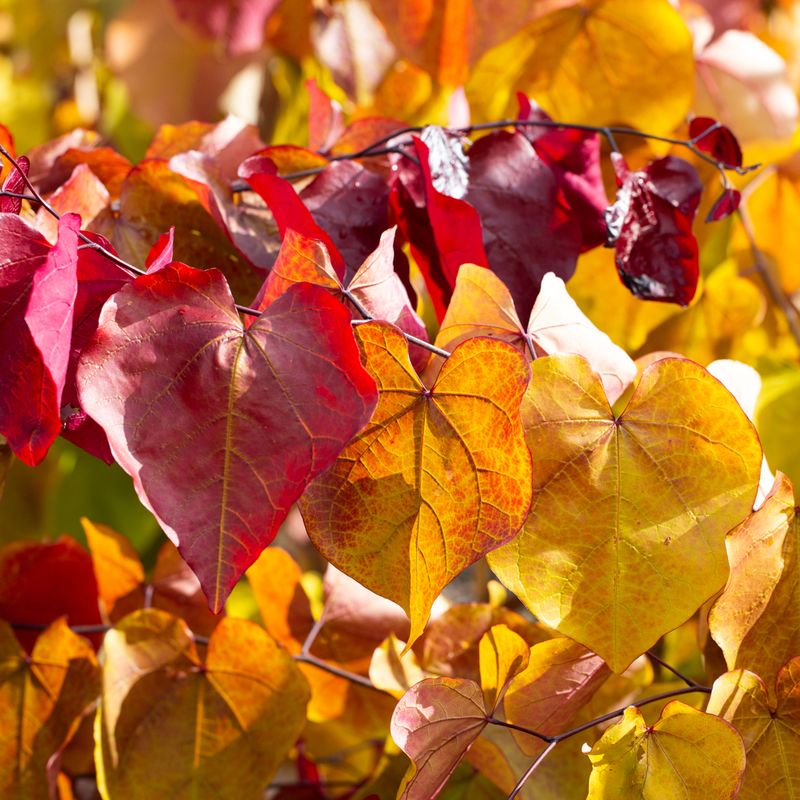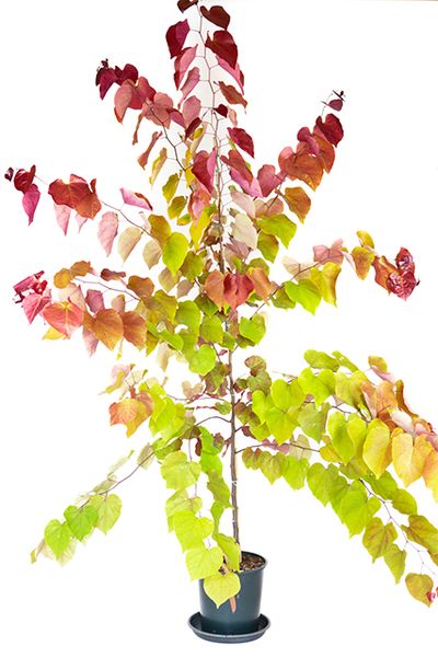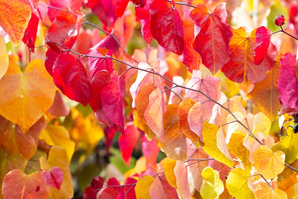 Glossy foliage emerges fiery red, turning burnt orange-yellow as they age. Small pink flowers in spring. Read more