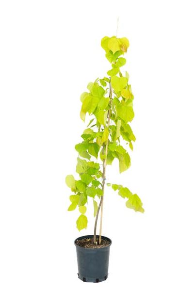 Steeply pendulous small tree with glowing, golden yellow, heart-shaped leaves. Pink flowers in April/May. Read more