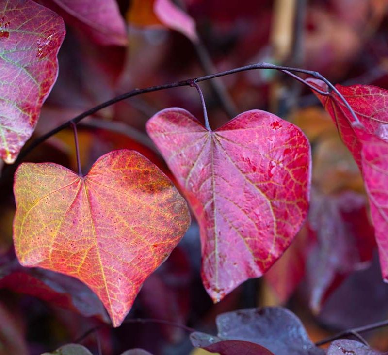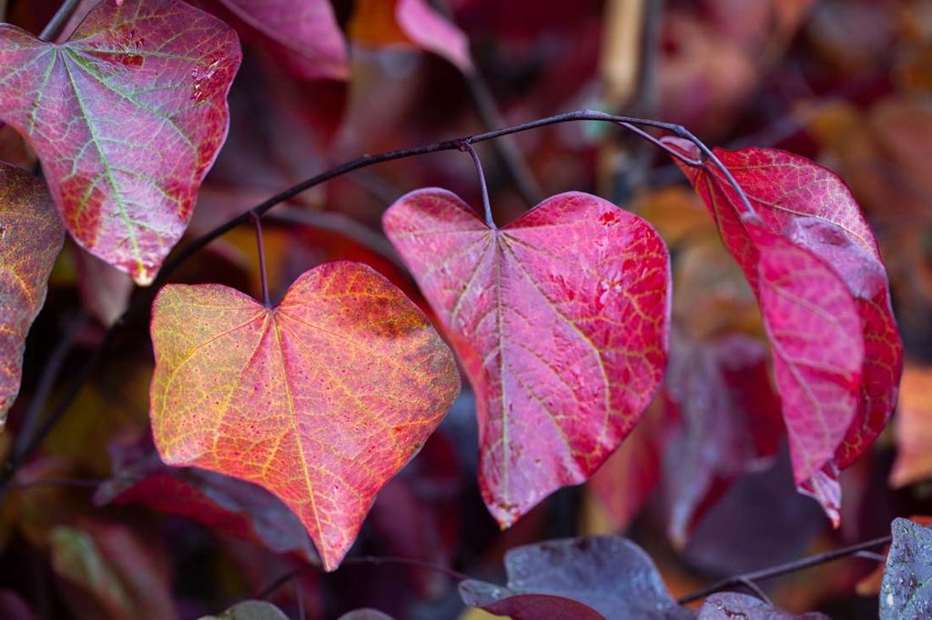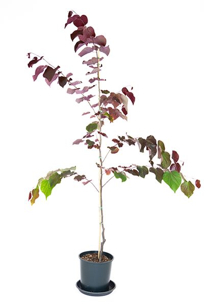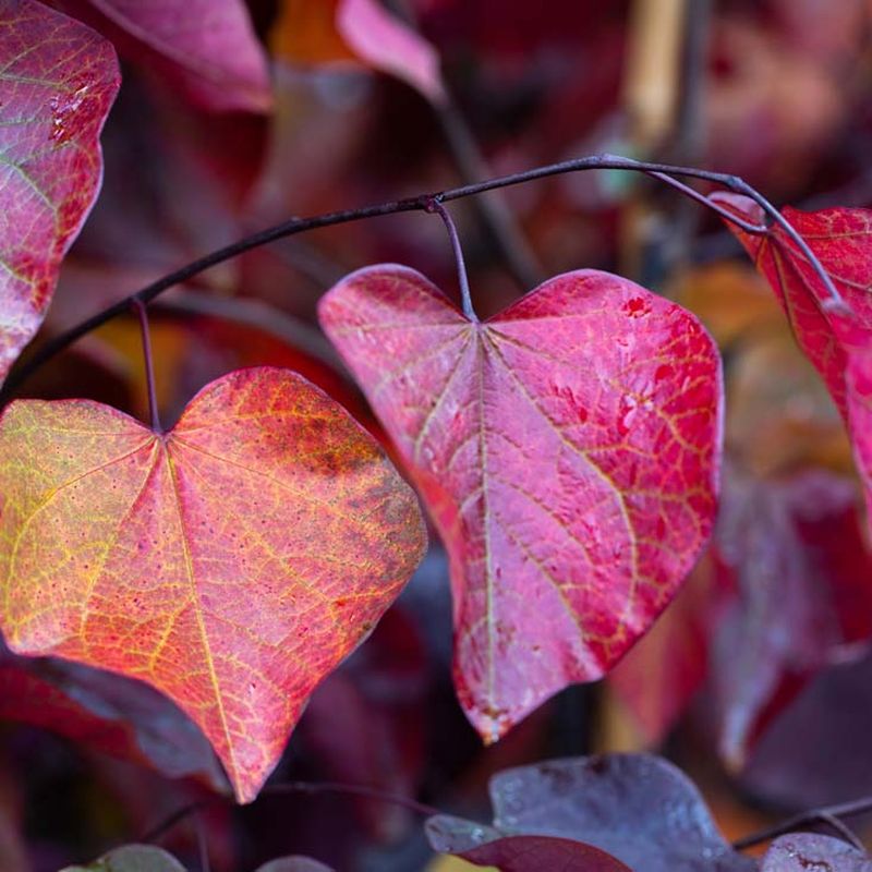 Description: Cercis canadensis ‘Forest Pansy’ makes a dramatic, small, often multi-stemmed tree. In spring, crimson, purple or pink flowers appear on the bare stems. The glorious heart shaped leaves emerge a glossy, vibrant ruby red and darken to a rich purple plum shade for the summer. In autumn they turn striking shades of orange, red, yellow and purple. Received the Royal Horticultural Society's Award of Garden Merit.