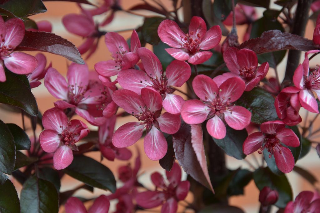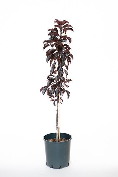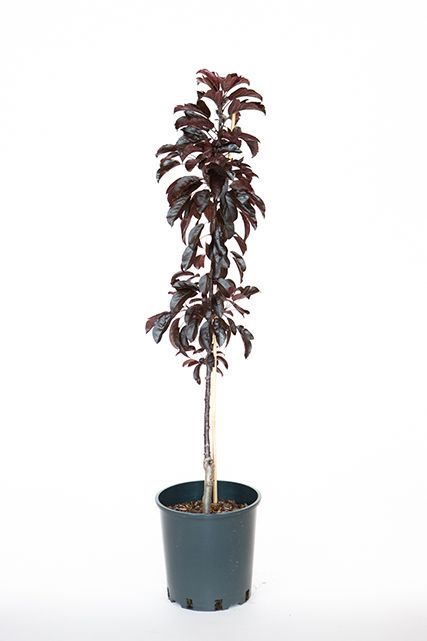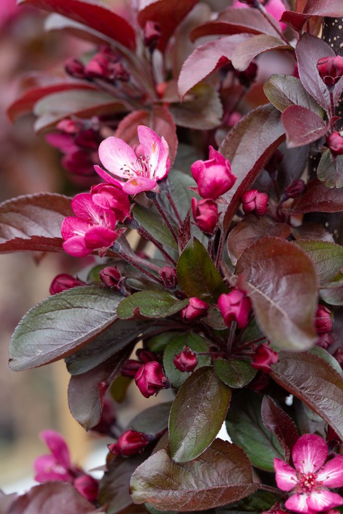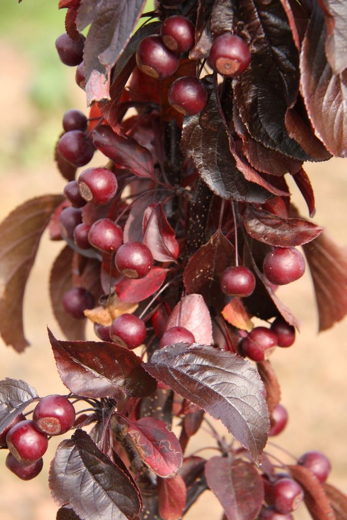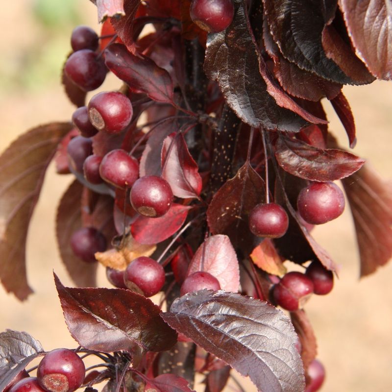 Description: A stunning dwarf, upright tree. Leaves emerge shiny dark burgundy to black turning slightly green with age. Bright purple/pink flowers in the spring turn to very dark red/maroon persistent crab apples in the autumn. Ideal for patio growing or small spaces.