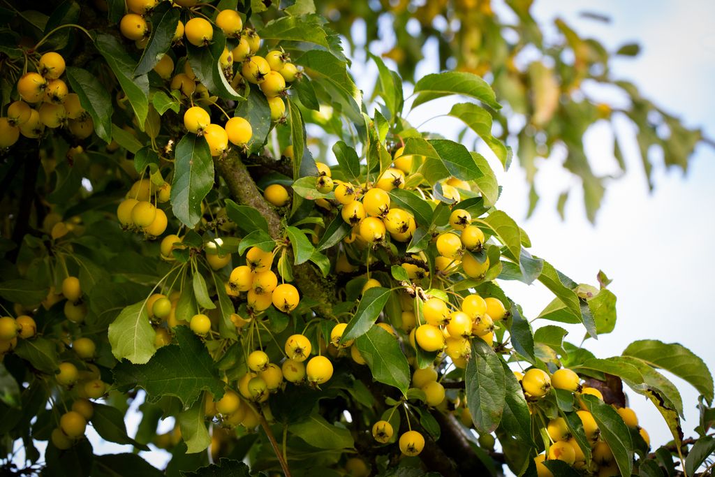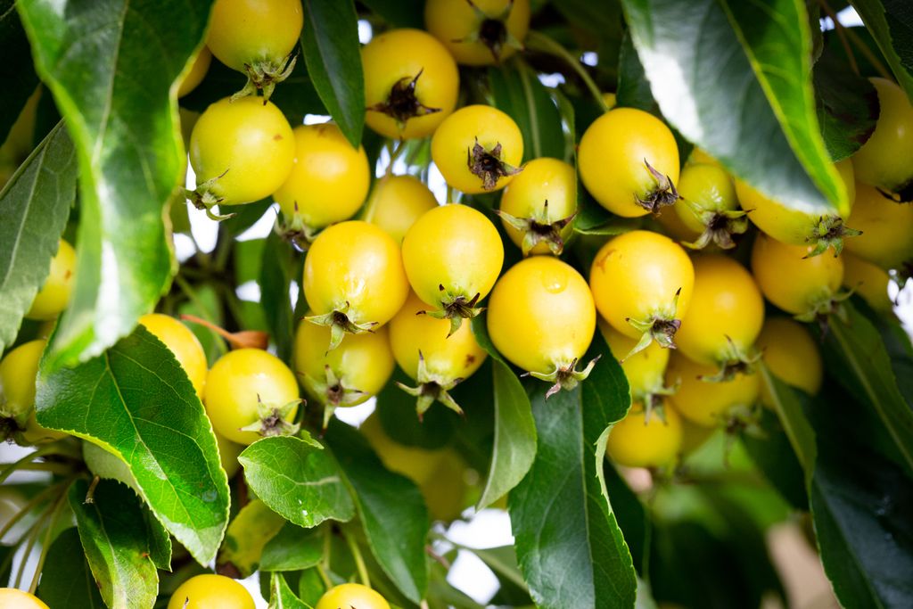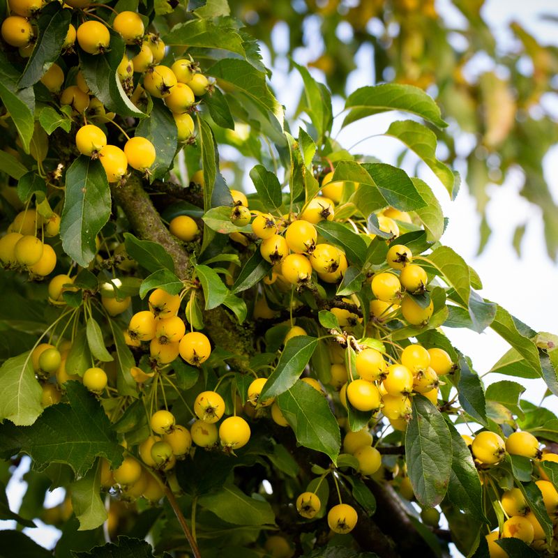 Smallish, elliptic, yellow fruits that usually persist well after Christmas. Med-sized tree, white flowers in April. Read more