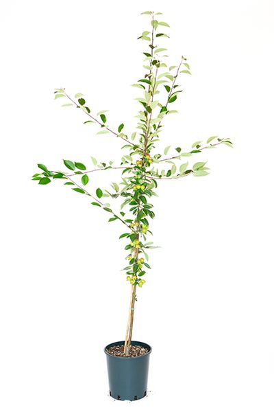 Ideal for patio tubs and smaller spaces as it produces a true mini tree. Height is no more than 2 metres with little support required. Heavy cropping fruit trees may need a permanent stake. Fruiting begins in the first year. Very little pruning needed.