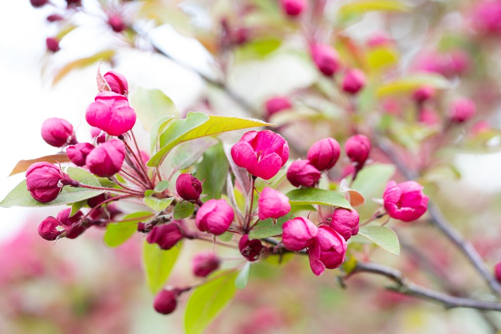 Dark red buds, large deep pink flowers. Glossy red fruit change to orange and persist into January. Purple leaves. Read more