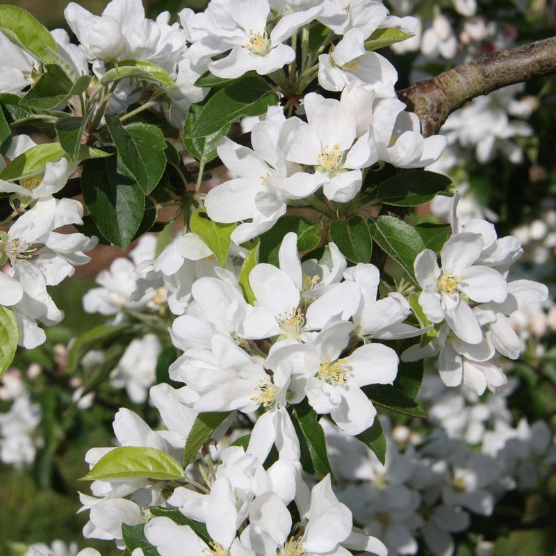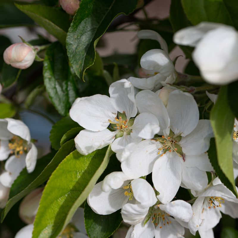 White flowers open from pink buds in spring followed by red-orange fruit. Vigorous upright tree, popular for jelly. Read more