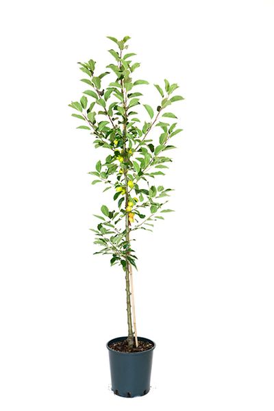 Ideal for patio tubs and smaller spaces as it produces a true mini tree. Height is no more than 2 metres with little support required. Heavy cropping fruit trees may need a permanent stake. Fruiting begins in the first year. Very little pruning needed.