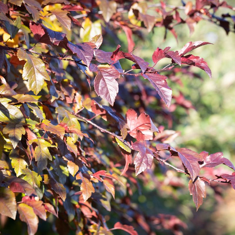 Bright, shiny, purple lobed leaves turning rich, dark green with age. Orange/red in autumn. Rich pink blossom. Read more