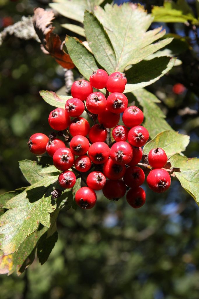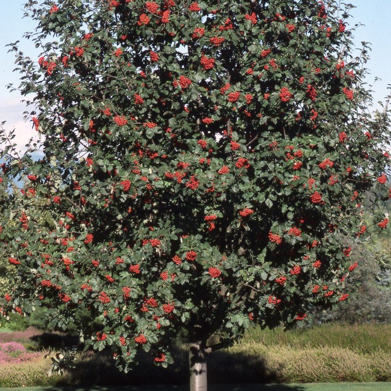 Description: A medium sized deciduous tree with ascending main branches and a rounded crown, bearing dark green, lobed foliage with greyish white hairs on the underside. Dense clusters of fluffy white flowers in spring are replaced by large, round, scarlet red berries which provide a feast for wild birds in the autumn.